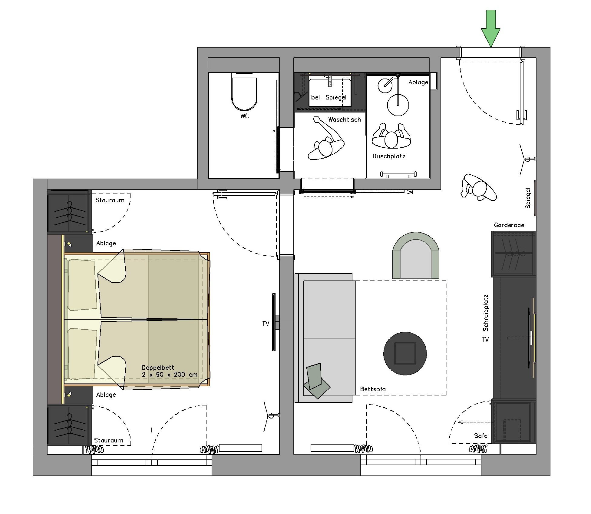 - einen Schreibtisch und Sitzgelegenheiten (Sofa oder Sessel)